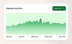 Over the past 10 years, we can see that there is a gradual rise in interest in vegan food, peaking around late 2019. Since then, there’s been a gradual decline, perhaps signalling that either their desire is waning, or that it’s becoming more a part of everyday life that it’s now something people don’t need to hunt for.