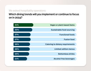 This was certainly Lightspeed’s findings in our 2024 Hospitality Insights and Dining Report. We found that amongst hospitality business operators, implementing vegan or plant-based offerings was the top priority for 2024 with 31% of business owners identifying it as most important.