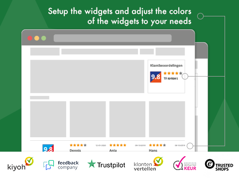 Link your KiyOh, Klantenvertellen, Webwinkelkeur, Feedback Company, Trustpilot or Trusted Shops account with the Custom Review Widget app and your current score will be automatically updated every day.