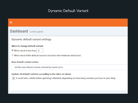With Dynamic Default Variant, it is possible to automatically change the standard variant when it is no longer in stock or has reached a threshold.