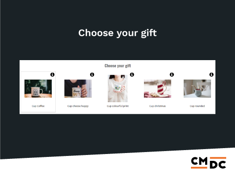 Once you have installed the app, you will have direct access to the CMDC app framework. The app can be set up in the CMDC app framework. You create a gift, you choose either a product to which the gift is linked or a minimum amount that makes the gift available. Once you have entered these settings, the gifts will appear within a few minutes.