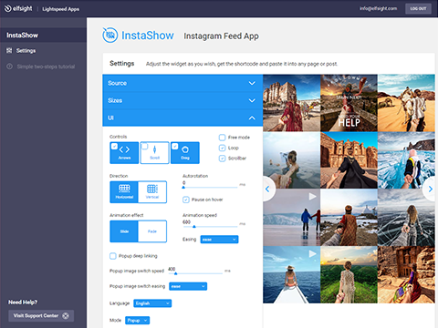 Team Elfsight proudly presents the all-new app for Lightspeed Stores that allows displaying fantastic galleries of Instagram images - InstaShow. User friendly, filled with a large pack of customizable parameters and suitable for any needs, InstaShow will become an irreplaceable plugin allowing you to share any photo from any public Instagram account or by any hashtag on your Lightspeed website. Choose appropriate sources, manage sizes and set different colors – you are welcome to customize the Lightspeed Instagram App as you wish.