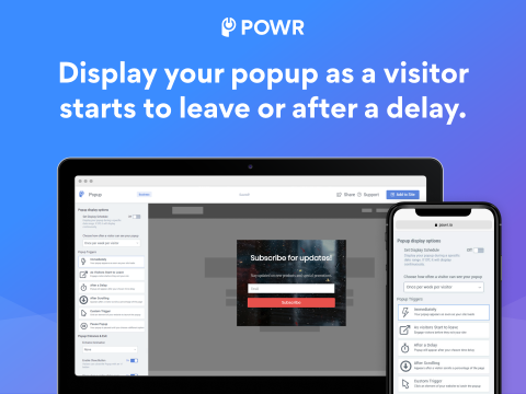 - Custom triggers: show Popup with time delay, show Popup on a click, or show Popup when user is about to exit your page.