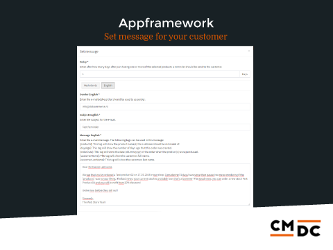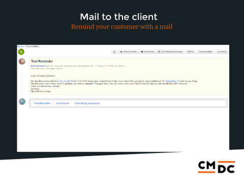 Product Reminder reminds your customer of the fact that he has to re-order his ordered products. You link one or more products to a reminder, make a nice reminder and the number of days that have passed since a purchase and your customer always receives a reminder in time.
