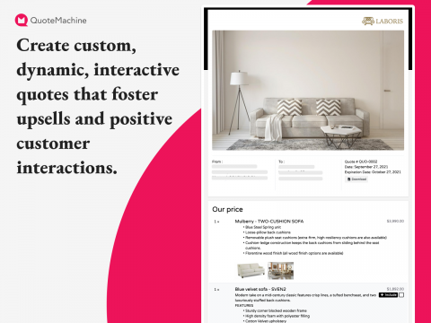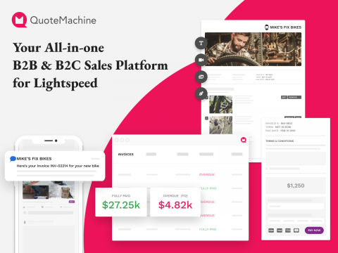 QuoteMachine takes online selling to the next level, with customizable sales documents built to work for you. With QuoteMachine, you can send personalized offers to your customers, bill them with custom payment terms, and foster positive relationships with chat and scheduling features. Also available for integration with Lightspeed Retail