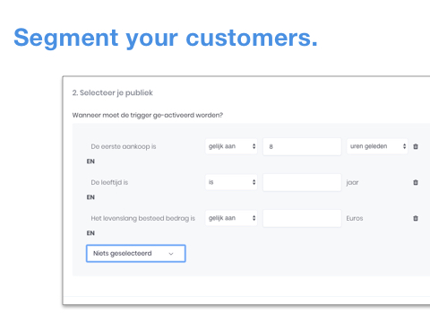 Relevant and personal marketing generates more revenue and happy customers. With ReloadMailing you can segment on properties that you find relevant from your customers. Thanks to segmenting you approach your customers on a personal level and provide more value, relevant recommendations and much more.