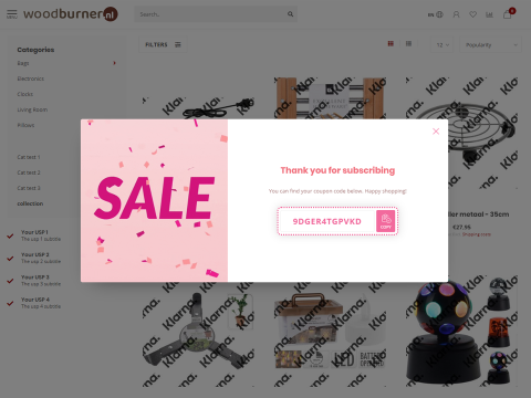 Shop visitors in doubt, or not sure if they're willing to buy something, can now be converted into a sale by giving them a small incentive. The SalesBoost Popups app will give your visitors a custom personal coupon code in exchange for a newsletter subscription. This way you'll have a direct sale, as well as future sales oppertunity by collecting their email address. Of course you can also hand out coupon codes without newsletter subscriptions.