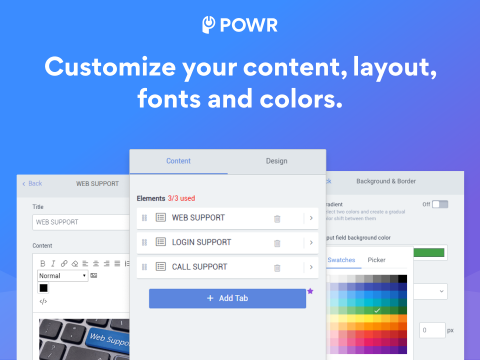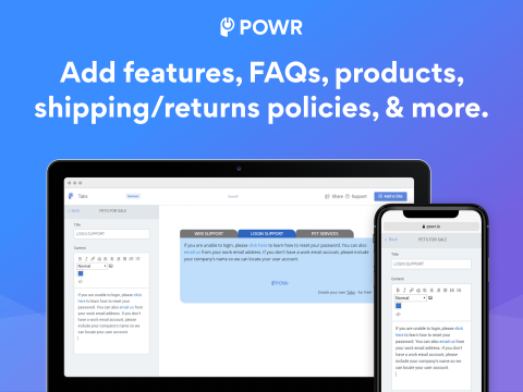 POWR Tabs makes it easy to organize and display your content with fully-customizable navigation Tabs. Perfect for managing content and creating product pages. Match your site with adjustable colors, fonts, borders and backgrounds.