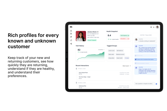 - Customer Spotlight – Keep track of your new and returning customers, see how quickly they are returning, understand if they are healthy, and understand their preferences.