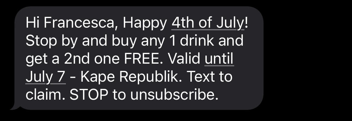 Here’s an example of a short but effective SMS message care of the cafe Kape Republik.