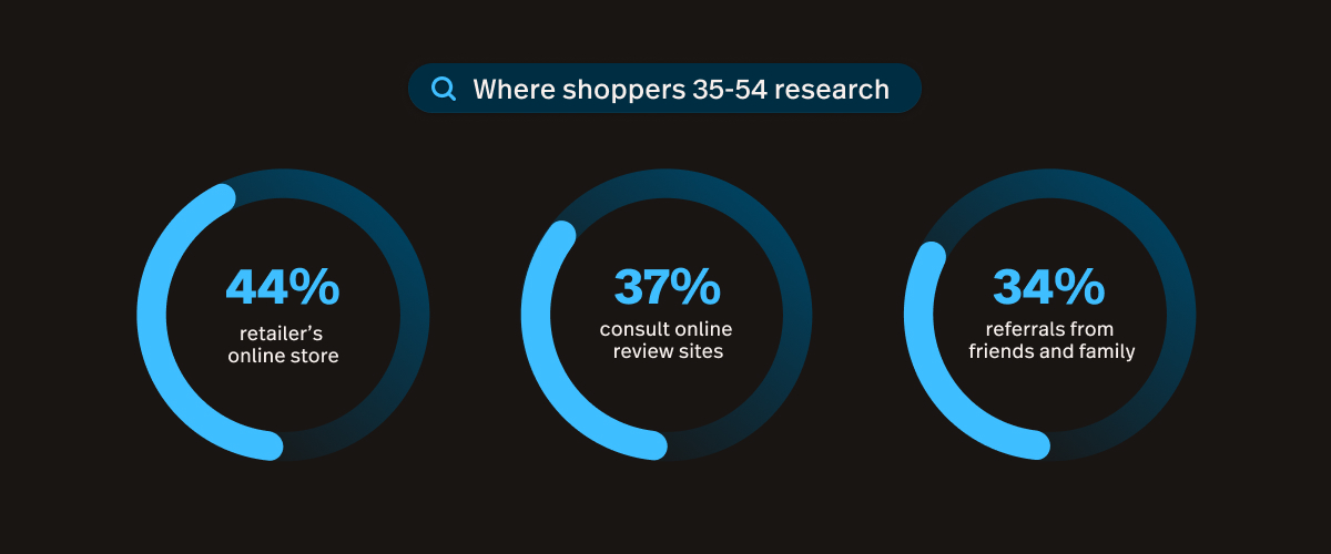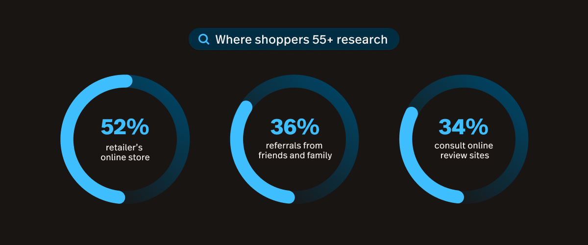 Shoppers above 55—the oldest members of Gen X, along with Boomers and older generations—like to go directly to the source when they’re in the consideration phase. They value information from their immediate community and what retailers put out into the world.