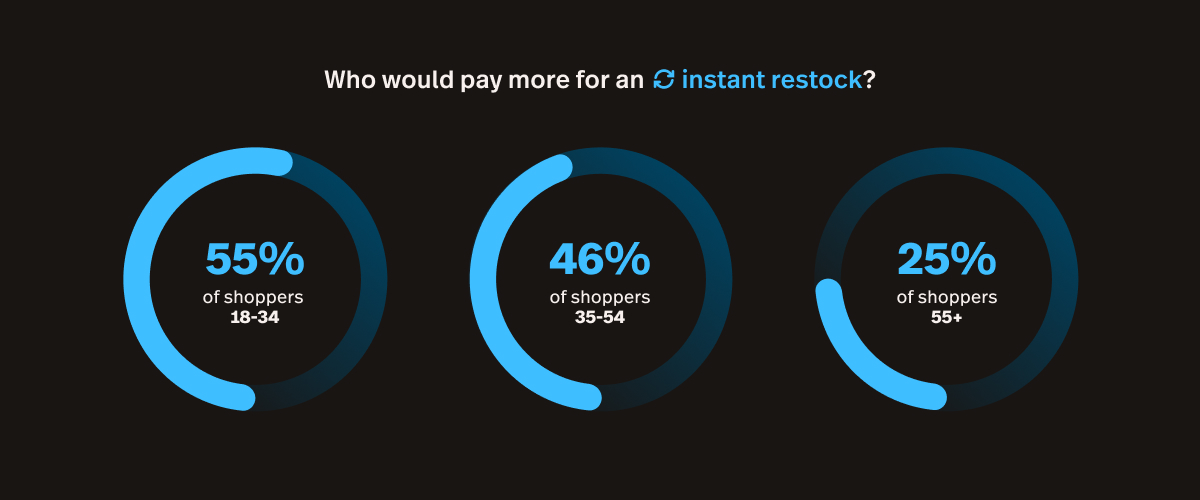 All other age demographics would wait for that item to be restocked, with only 36% of shoppers 35 and older willing to pay more for an instant restock—and the older they are, the less likely they’d pay.