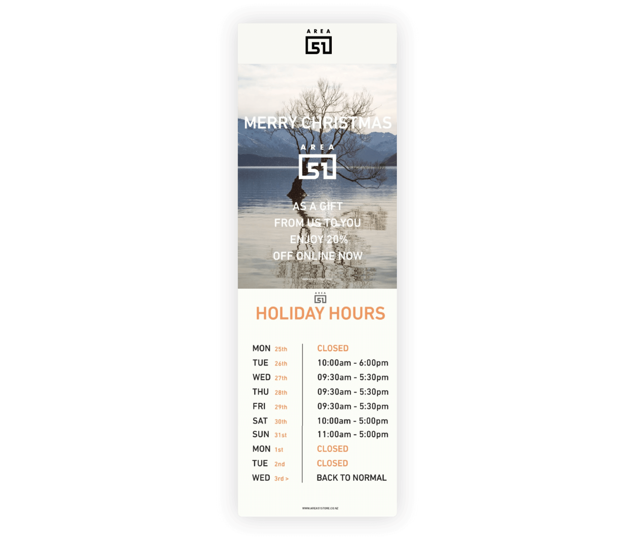 When the holiday season came nearer last year, Area 51 took the opportunity to remind their customers of their hours over that season, but they also sweetened the deal by offering 20% to their online customers, making sure their customers knew that online shopping at Area 51 was still an option.