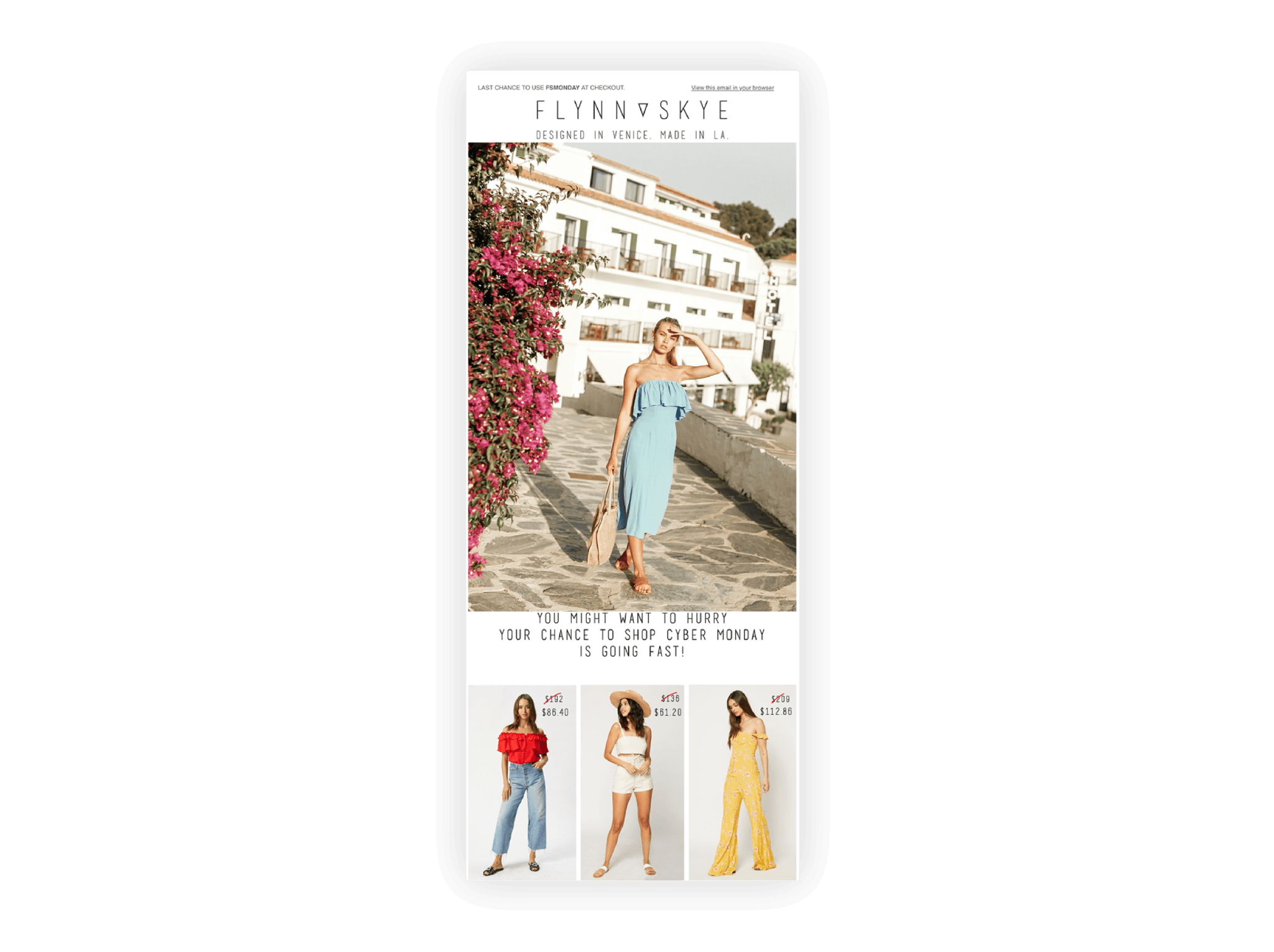 You know what they say: showing is better than telling. Apparel retailer Flynn Skye puts this nugget of wisdom to good use by creatively “slashing” their product prices. Check out the image of their email below and you can clearly see the original price crossed off and replaced with their promotional pricing.