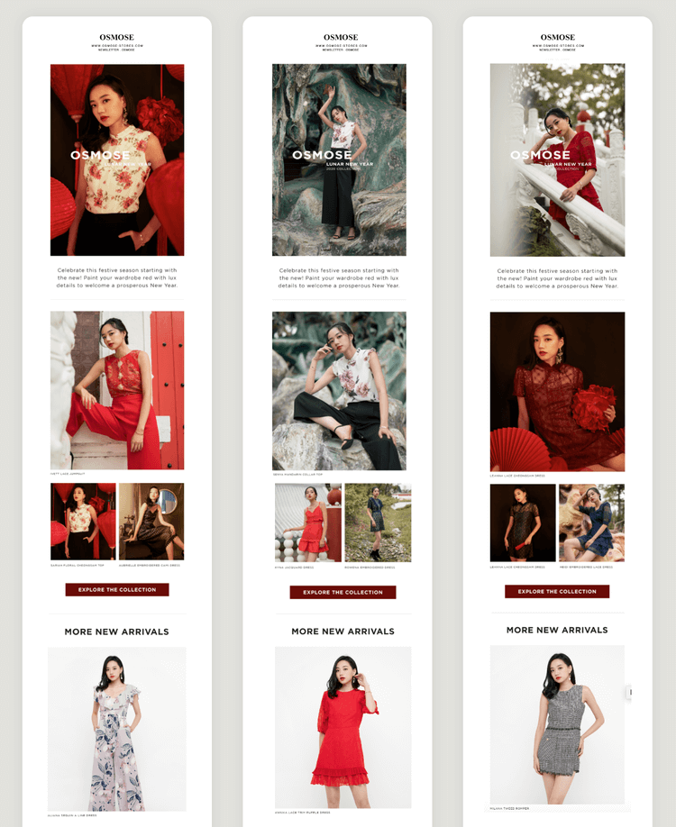 OSMOSE, a Singapore-based specialist in women’s fashion, knew that Chinese New Year was the perfect holiday to market to their current customers. The overarching theme of their email was the color red, which is considered a symbol of luck and prosperity during the hugely popular holiday. In fact, red is the official color of Chinese New Year. They encourage email recipients to “paint your wardrobe red” to “welcome a prosperous new year”. Check out their gorgeous customized email flow below.