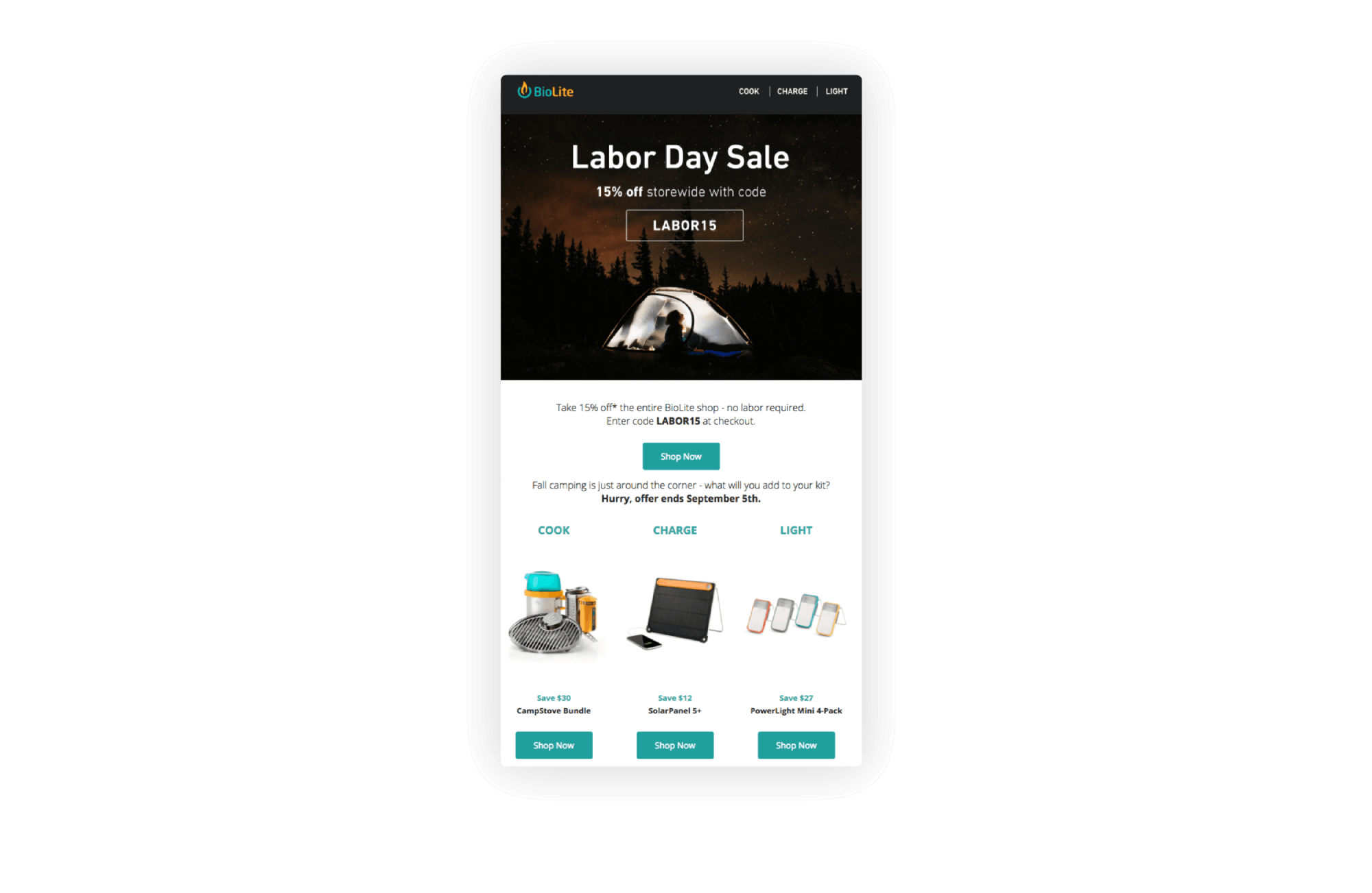 BioLite has created this sense of urgency by reminding their customers exactly when their sale ends and leaving that reminder in bold. They’ve then gone the extra mile and suggested some of their categorized top picks.