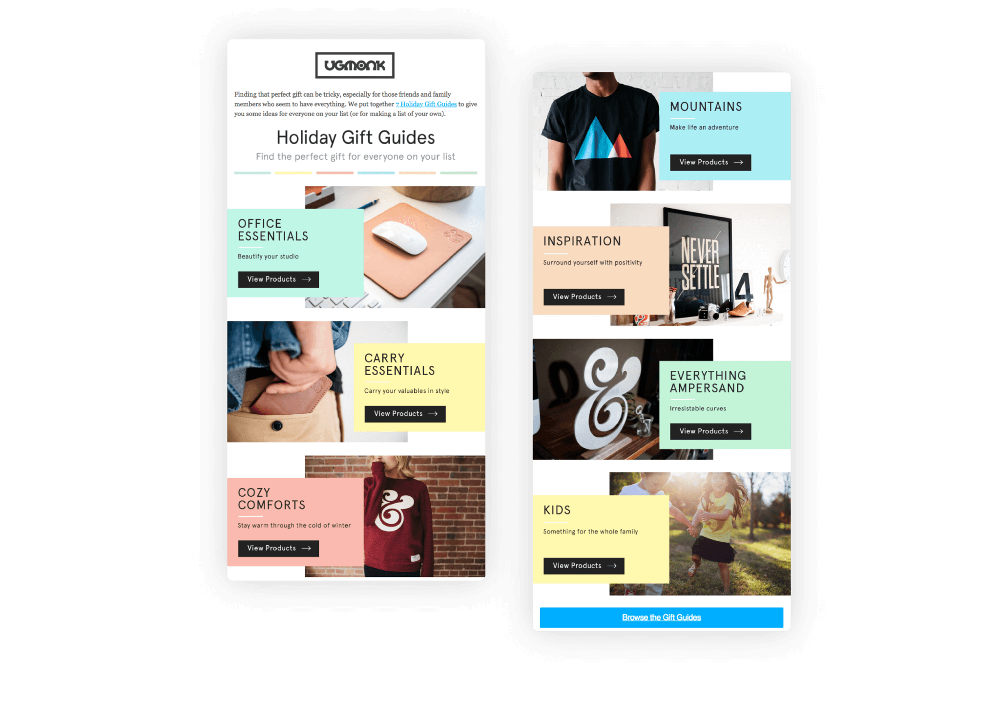 When UGMONK released an email gift guide last year, they didn’t just stick to the mainstays of ‘gifts for mom’ or ‘his & hers’ organization. With guide sections such as ‘cozy comforts’ and ‘mountains’, they were able to curate a guide that would appeal to anyone.