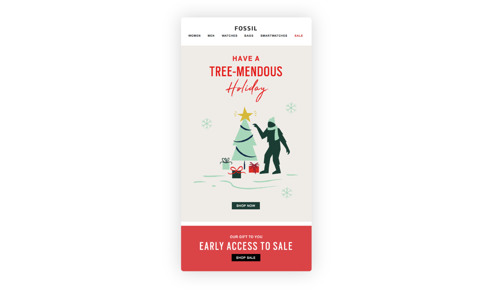 Accessories store Fossilcreated vibrant and on-brand emails with a cute differentiator—a stand-out, festively decorated pun. They wished that their customers “have a tree-mendous holiday” and then drew attention to their early access sale and perks such as gift wrapping.