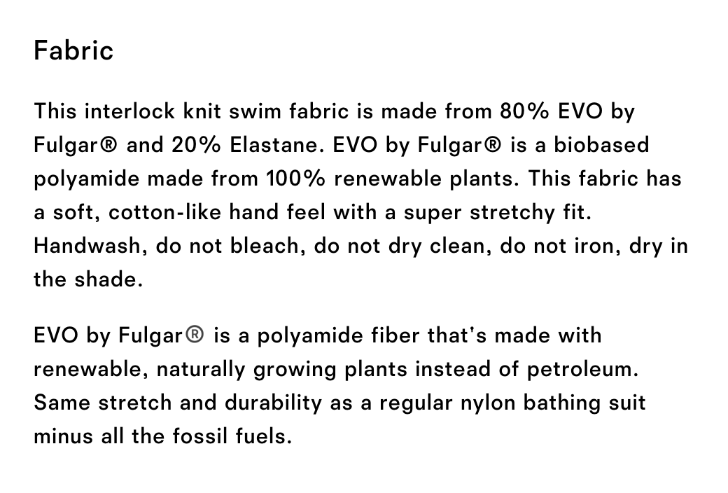 For example, Reformation uses a fabric called EVO, a biobased polyamide made from renewable plants. Explaining this on their product page not only highlights their sustainability goals but also helps customers understand their prices.