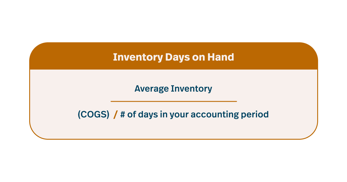 Average Inventory/(Cost of Goods Sold/# days in your accounting period) = Inventory Days on Hand