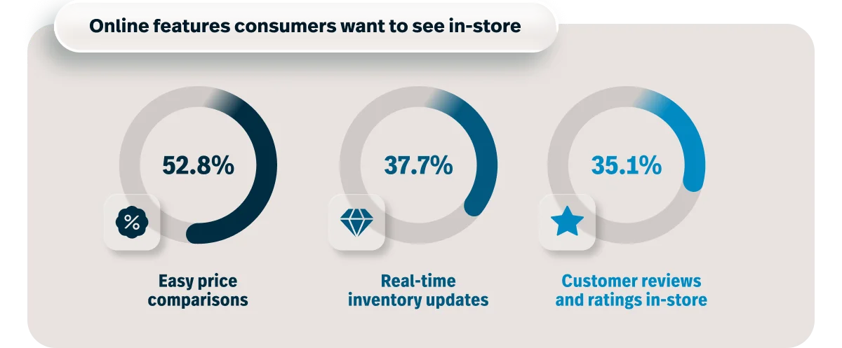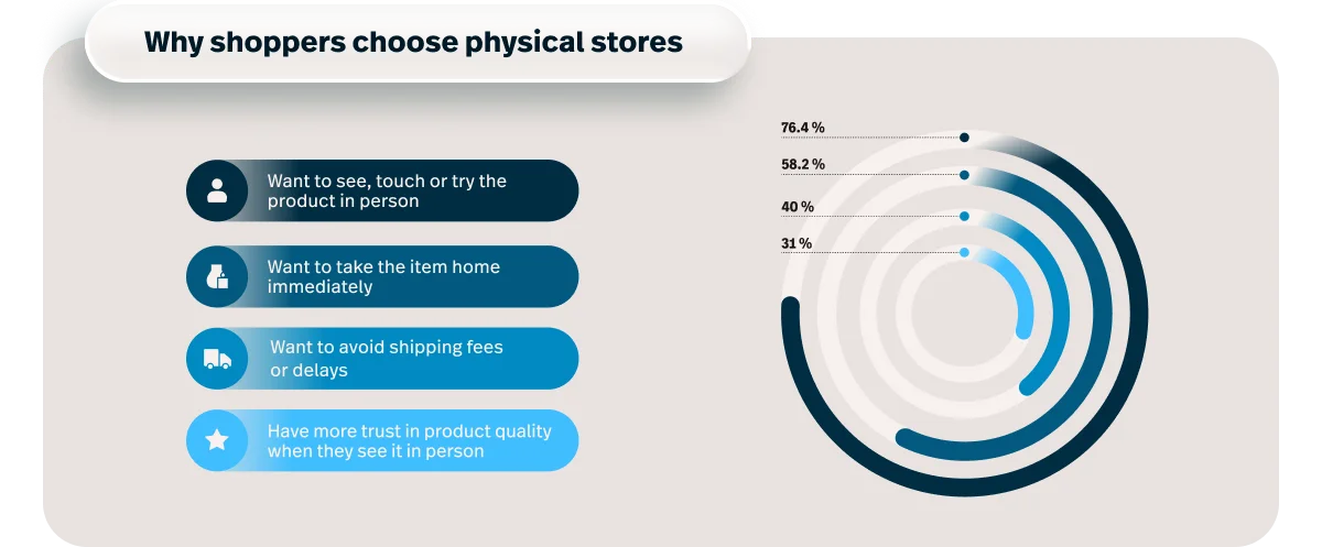While the majority of shoppers (76.4%) still want to see, touch, or try products in person—great news for physical retail stores—online conveniences have reshaped their expectations, even in physical spaces.