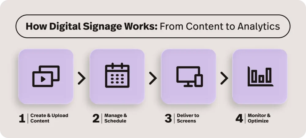 The software “brain” where you upload, organize and schedule content. Most modern CMS platforms are cloud‑based, with web dashboards and granular control by location, device or user role.