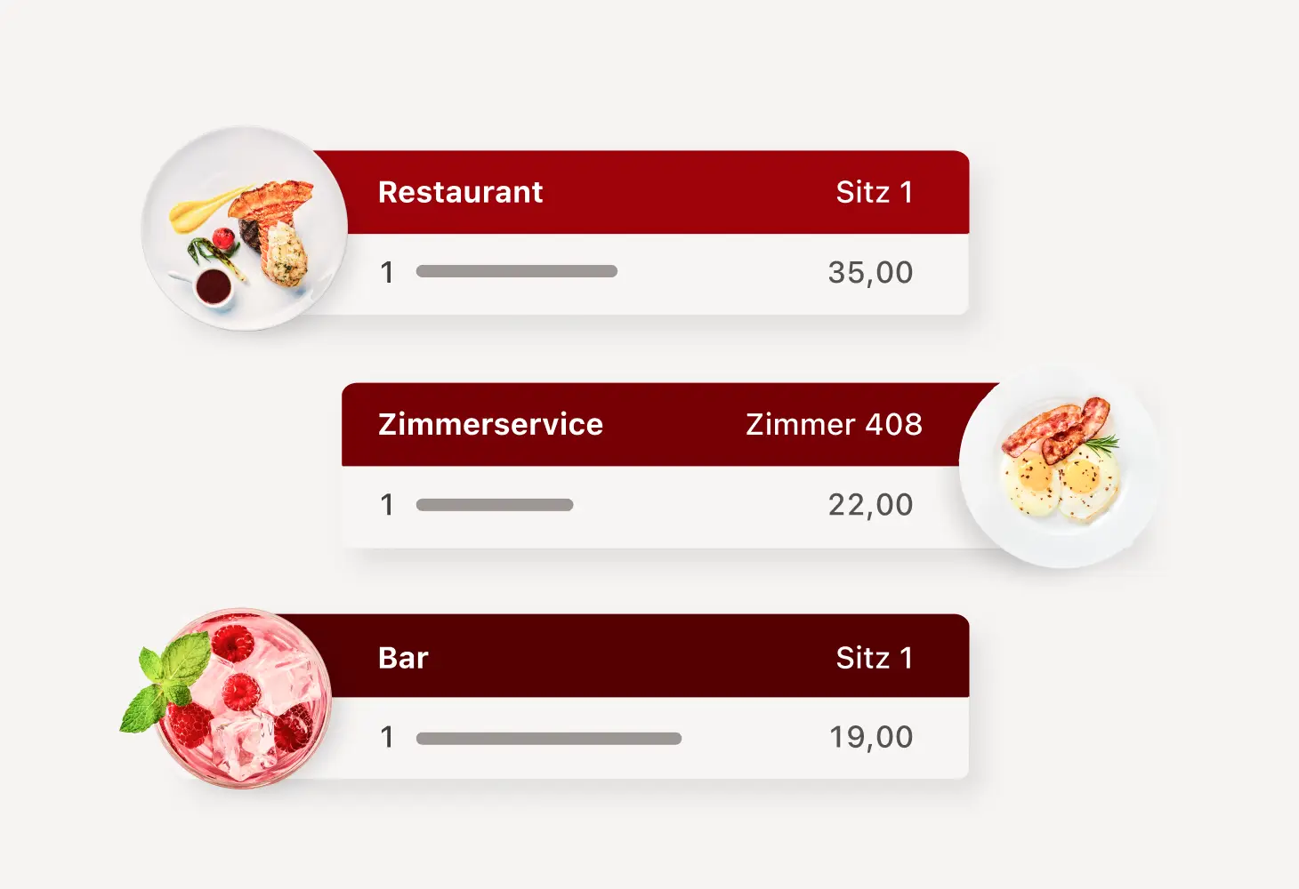 - Verfolgen Sie die Ausgaben Ihrer Gäste nahtlos vom Restaurant über die Bar bis zum Zimmerservice.