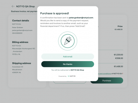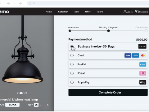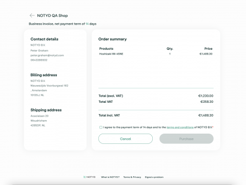 NOTYD is the B2B buy-now-pay-later payment method for online businesses, available in the Netherlands and Belgium. By allowing businesses to buy on invoice and pay with NOTYD - through the click of a button - webshops see their turnover grow up to 30%. With NOTYD business buyers can purchase on invoice just as they are used to, while the payment is guaranteed for you as a B2B seller. It improves your cash flow and you are spared the hassle of extensive administration and handling.