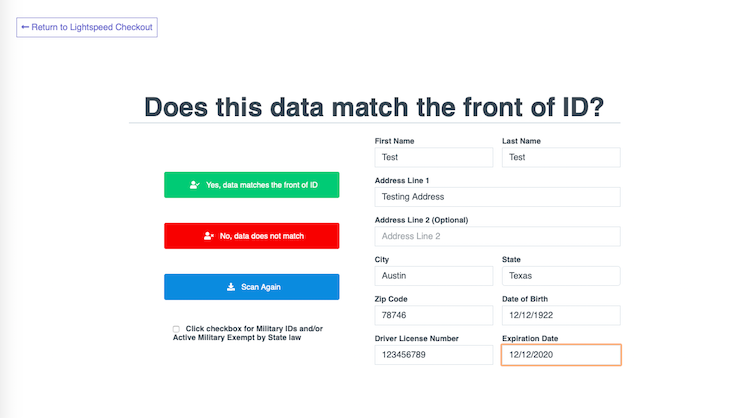 • BlueCheck Age Verification scans a US drivers license, checks the barcode format for authenticity, and verifies the data against 3rd party databases. Additionally, merchants have the option to record each scan and attach the record to the Lightspeed customer profile.