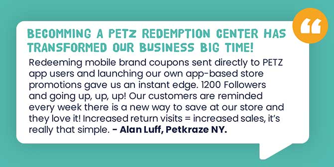 - Boosted Sales and Profits: Encourage return visits with PETZ. Every Thursday, anticipated push notifications are automatically sent to PETZ app users showcasing new coupons that can be redeemed at your store.