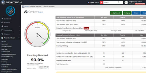 - Inventory Compare – once you perform an RFID inventory cycle count, you can quickly look at the Senitron inventory compare dashboard to see exactly how accurate your Lightspeed inventory is in comparison to RFID read inventory. This page makes it super easy to compare and identify discrepancies. Once done, with a couple of clicks, the inventory gets updated into Lightspeed, and a sync-report card gets emailed to you.