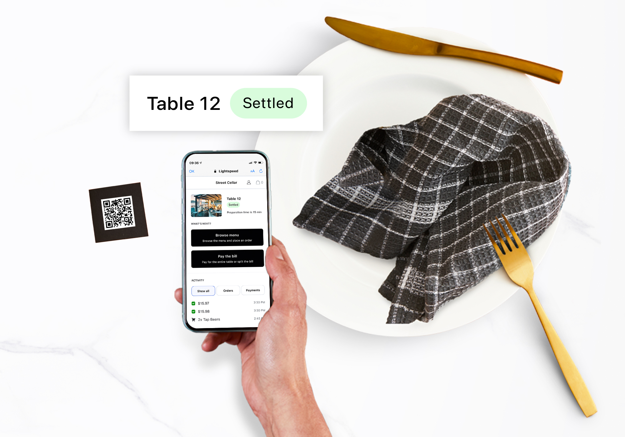 customer settling their restaurant tab on their mobile phone, next to a table setting with a QR code and napkin