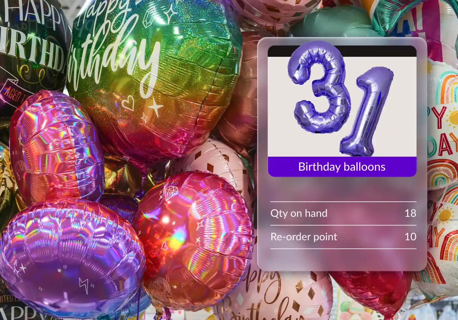 - Set reorder points and receive low stock alerts to ensure you're always on top of your party supply needs