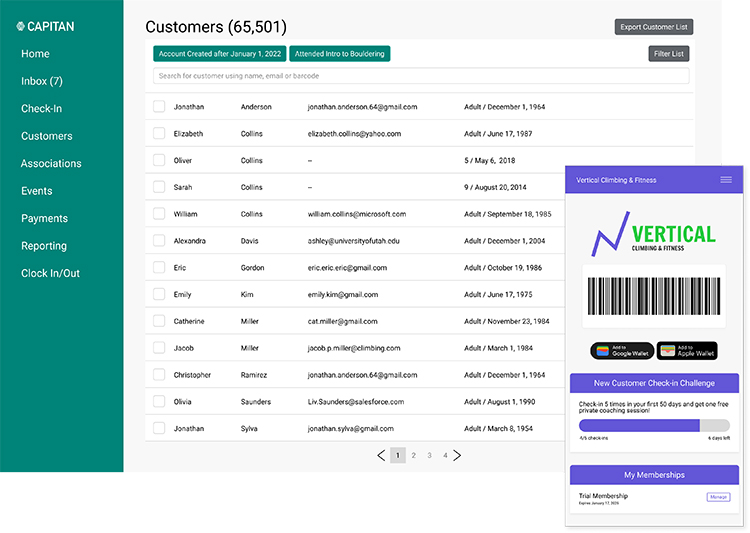 Capitan provides a CRM solution tailored for climbing gyms. Our software includes waiver and document management, membership and pass billing, event scheduling and reporting. Capitan’s fully open and supported API allows teams to connect to the other tools they use to run their business. Capitan is currently used by over 50 climbing centres, from boutique bouldering gyms to multi-location chains around the world.