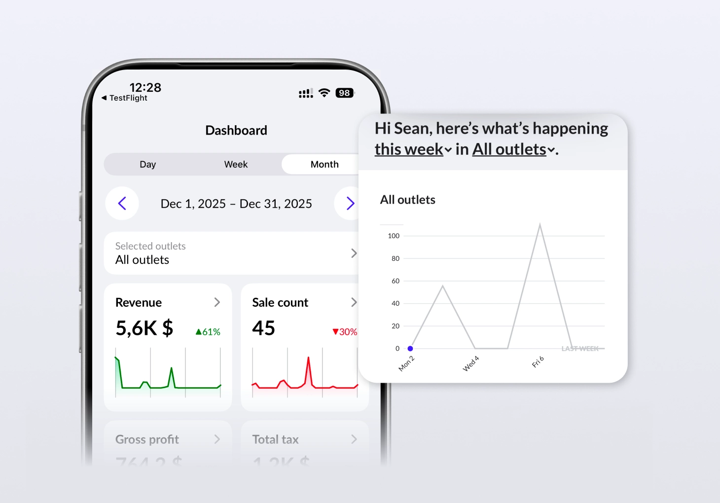 A new reporting dashboard in the Lightspeed Reporter app shows you key metrics in a snapshot. See revenue, sales count and other data accompanied by trends and mobile-friendly charts.
