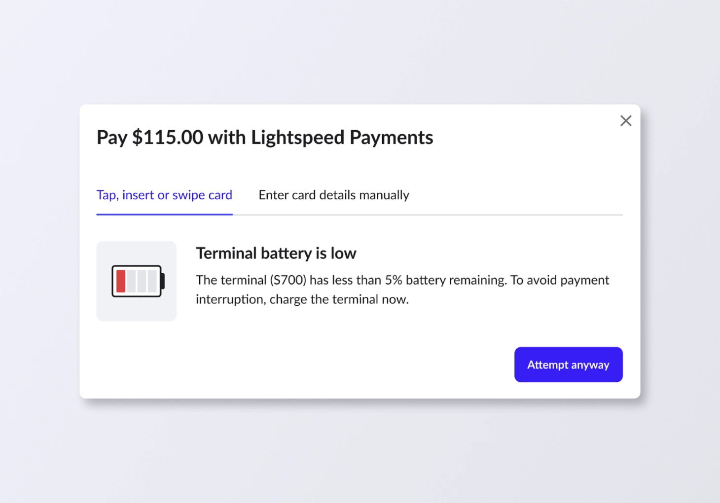 Our new terminal status alerts provide real-time updates during checkout to ensure a seamless payment experience. These notifications immediately flag if a terminal is busy, offline, low on battery or has a weak connection, allowing you to resolve hardware or connectivity issues on the spot and avoid transaction delays.