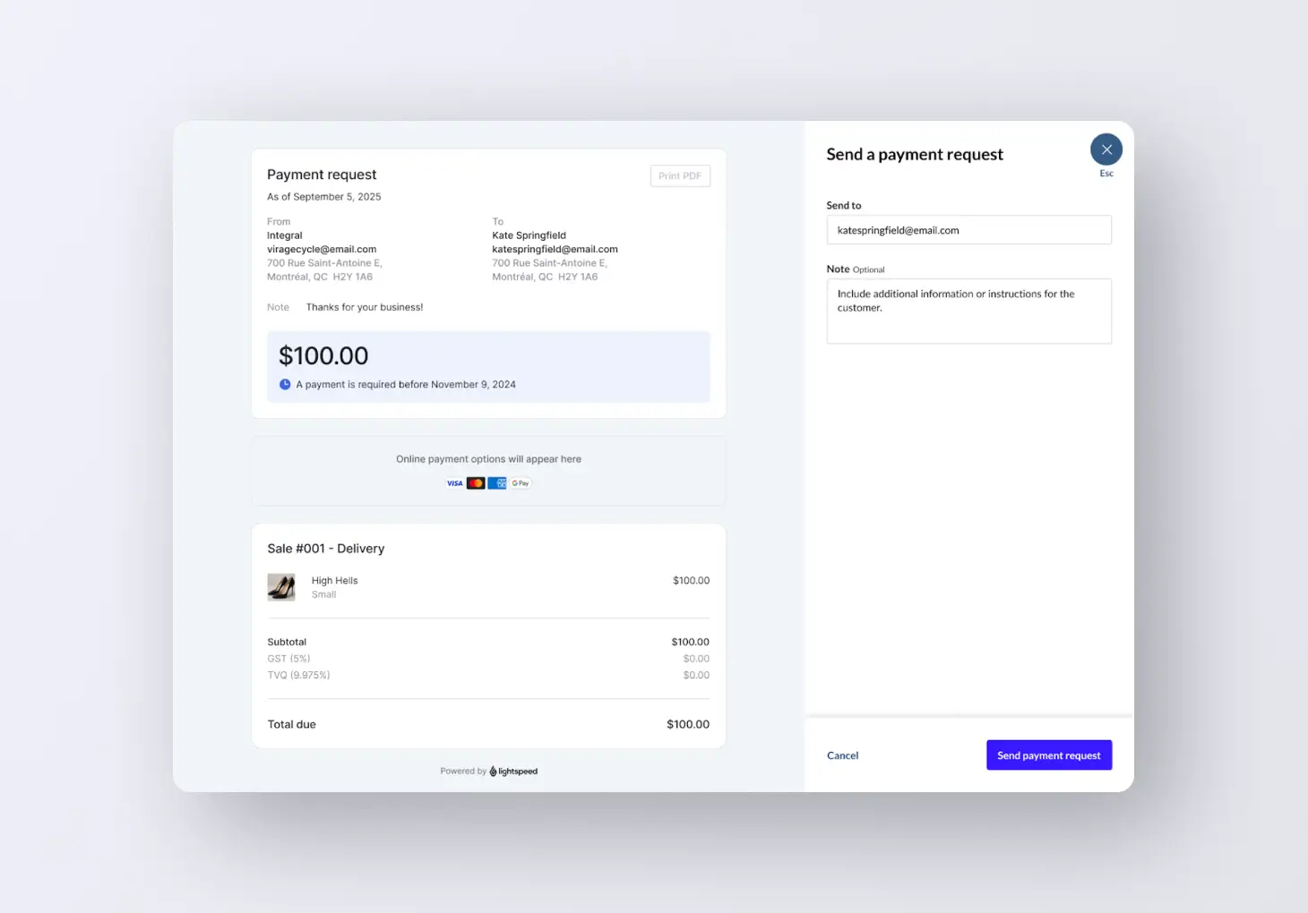 Now you can send customers remote requests complete with built-in payment forms on Lightspeed Payments. This means your customers can see key details and pay in one place.